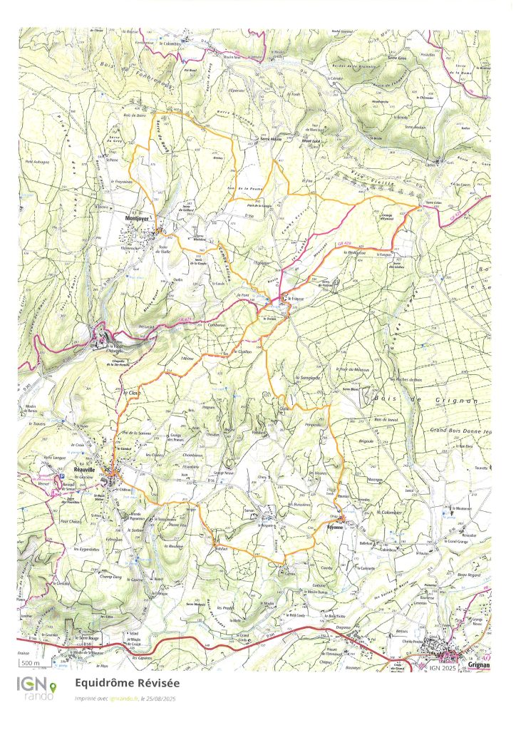 Les tracés sont réalisés à l’aide des outils que le département fournit (SIG) et des nombreuses reconnaissances terrains faites en amont. Les chemins empruntés sont tous publics ou déjà conventionnés pour une autre discipline. Vous trouverez une copie des tracés ci-dessous, une grande boucle coupée pour en créer une plus petite. Une pause pique-nique est prévue à mi-chemin au niveau de “La Citerne” sur la commune d’Espeluche.