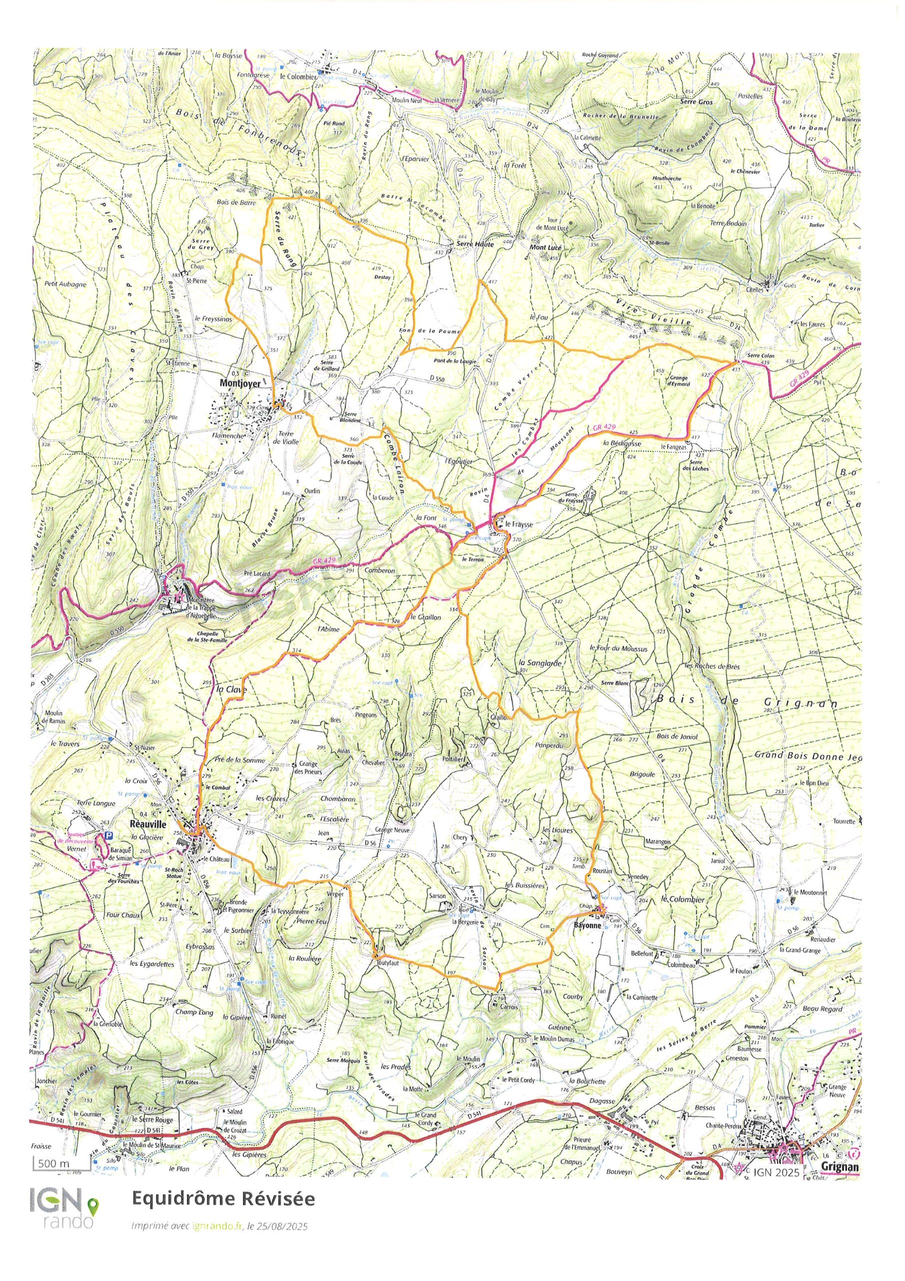 Les tracés sont réalisés à l’aide des outils que le département fournit (SIG) et des nombreuses reconnaissances terrains faites en amont. Les chemins empruntés sont tous publics ou déjà conventionnés pour une autre discipline. Vous trouverez une copie des tracés ci-dessous, une grande boucle coupée pour en créer une plus petite. Une pause pique-nique est prévue à mi-chemin au niveau de “La Citerne” sur la commune d’Espeluche.