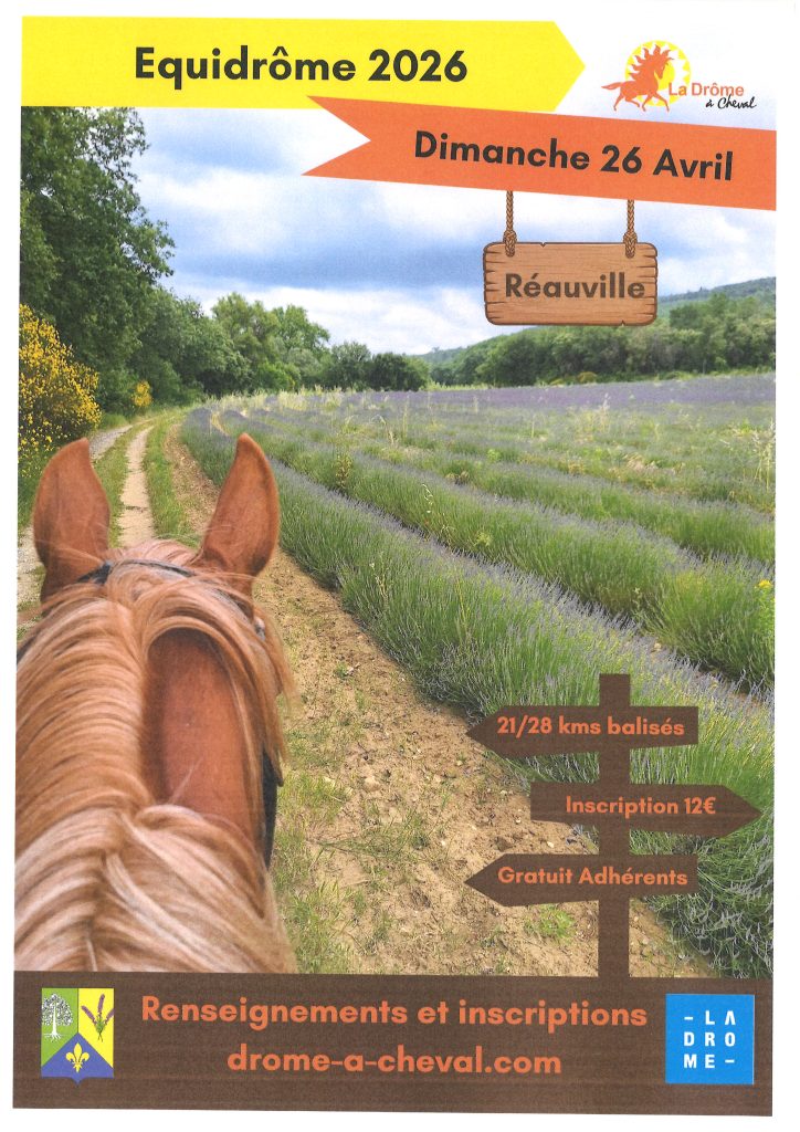 L’association La Drôme à Cheval organise le Dimanche 26 avril une journée de randonnée équestre se déroulant notamment sur les chemins de notre commune. Cette journée se déroule en partenariat avec la Mairie et au départ, de la commune de Réauville.